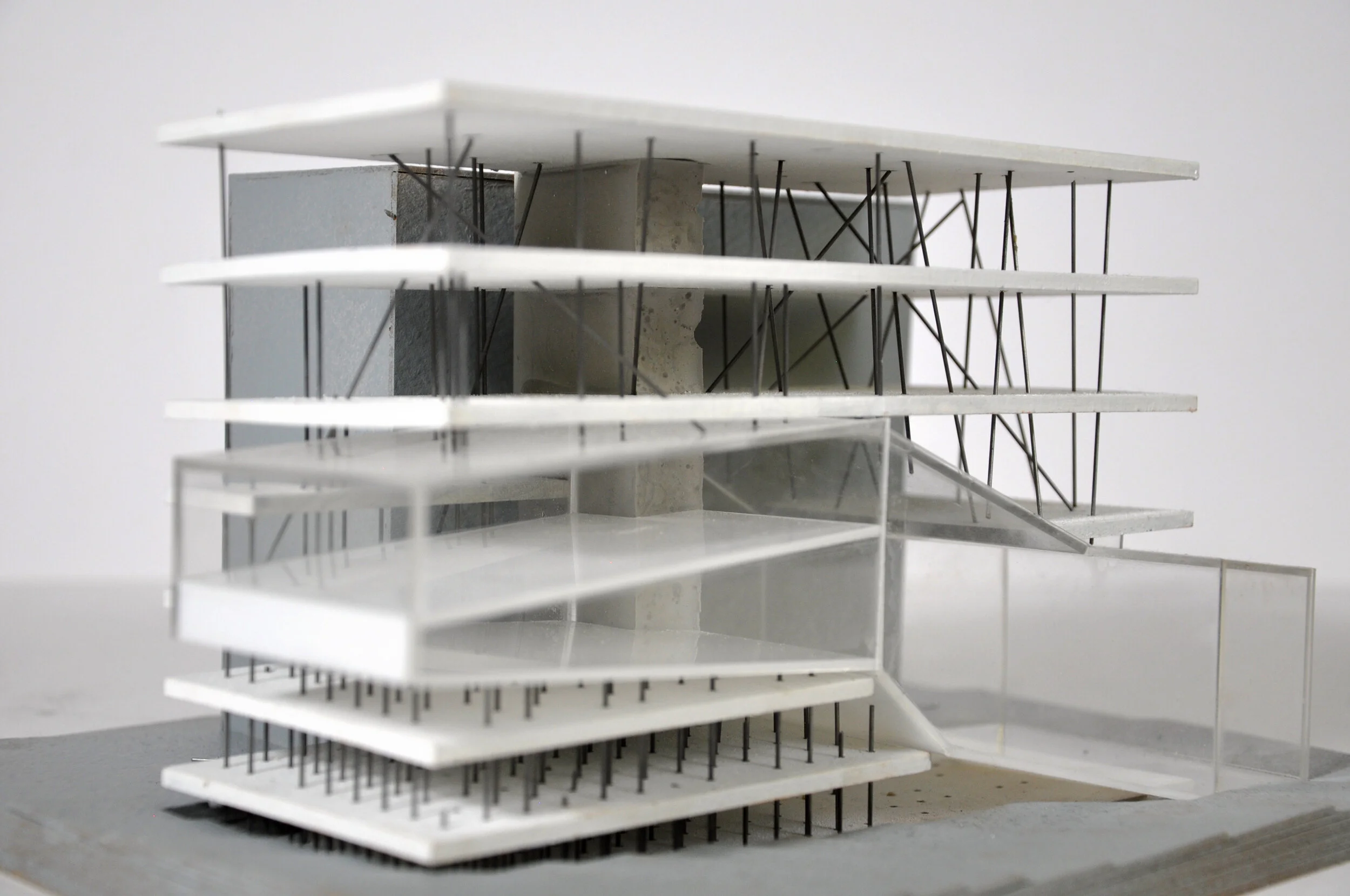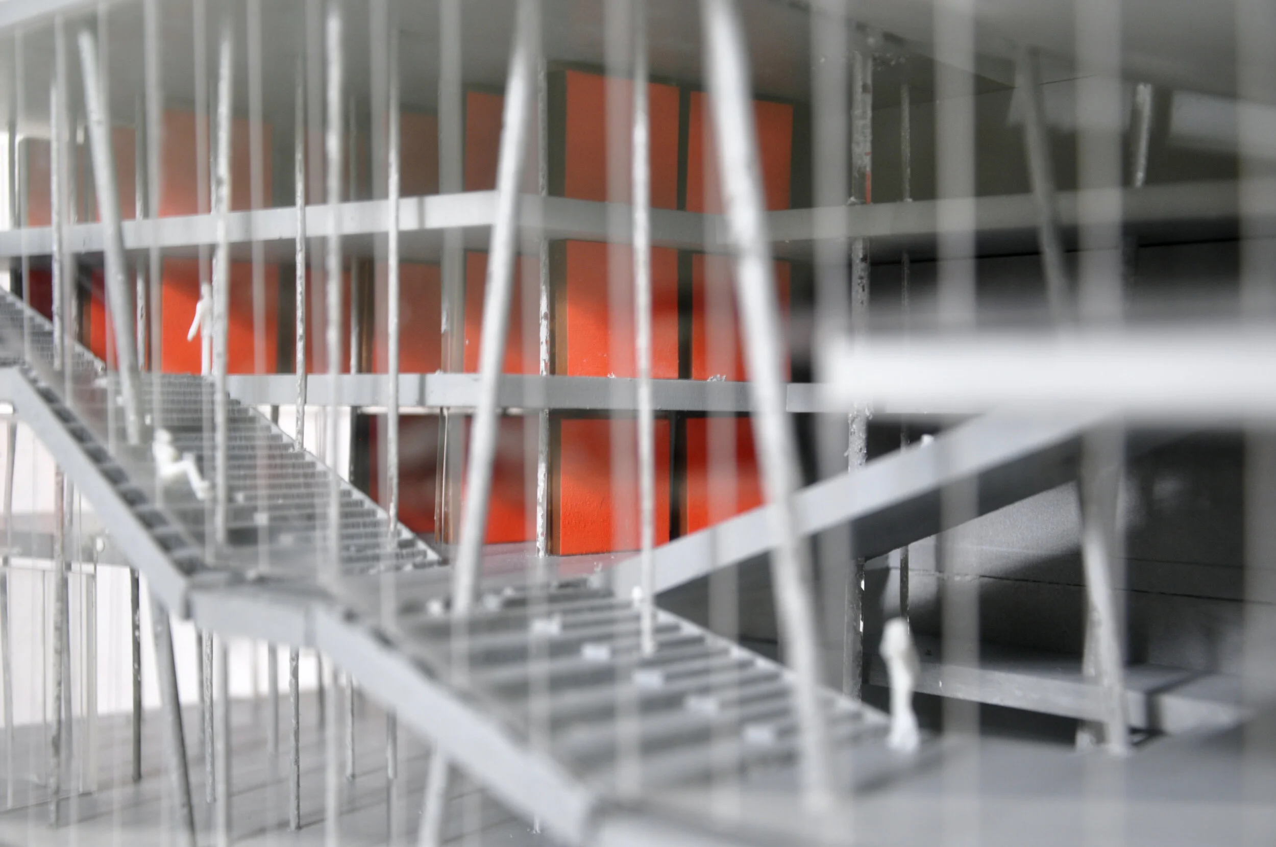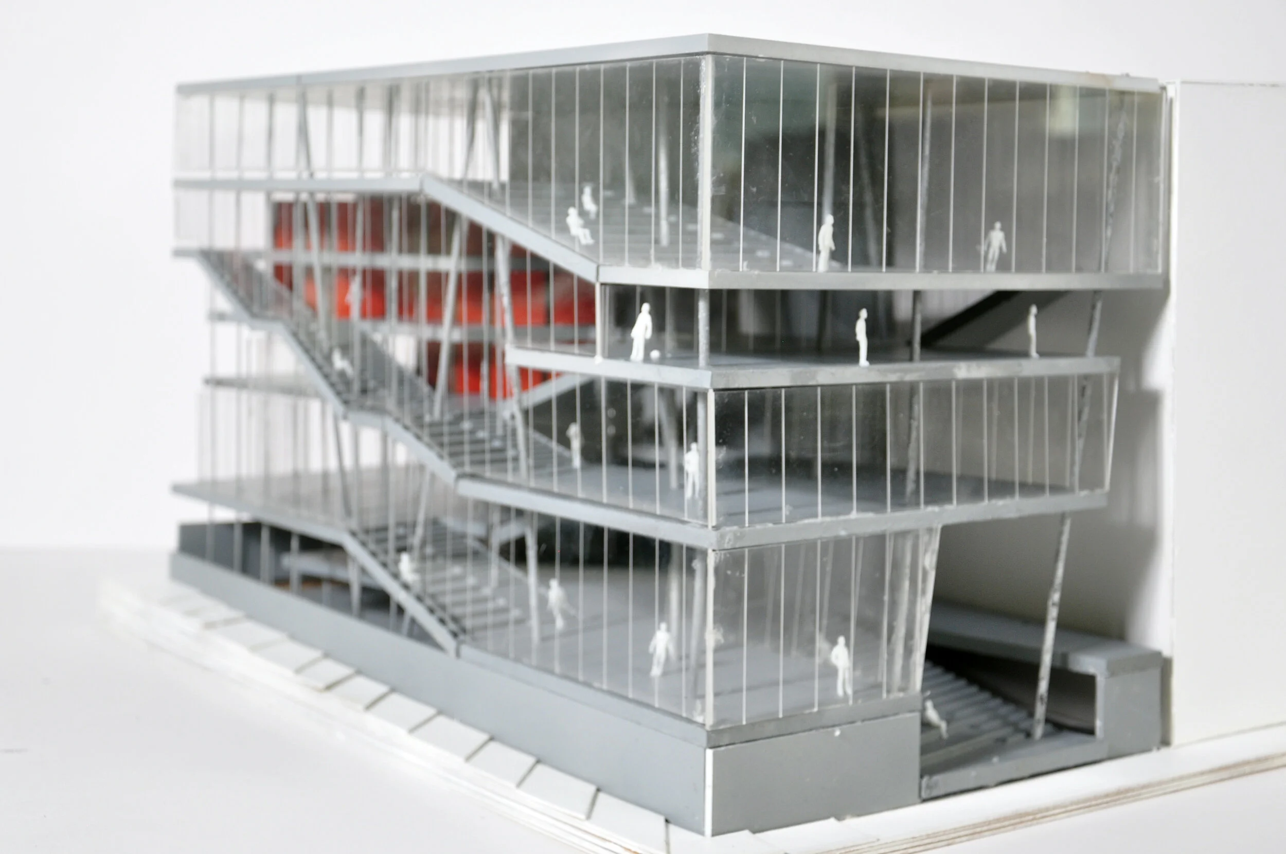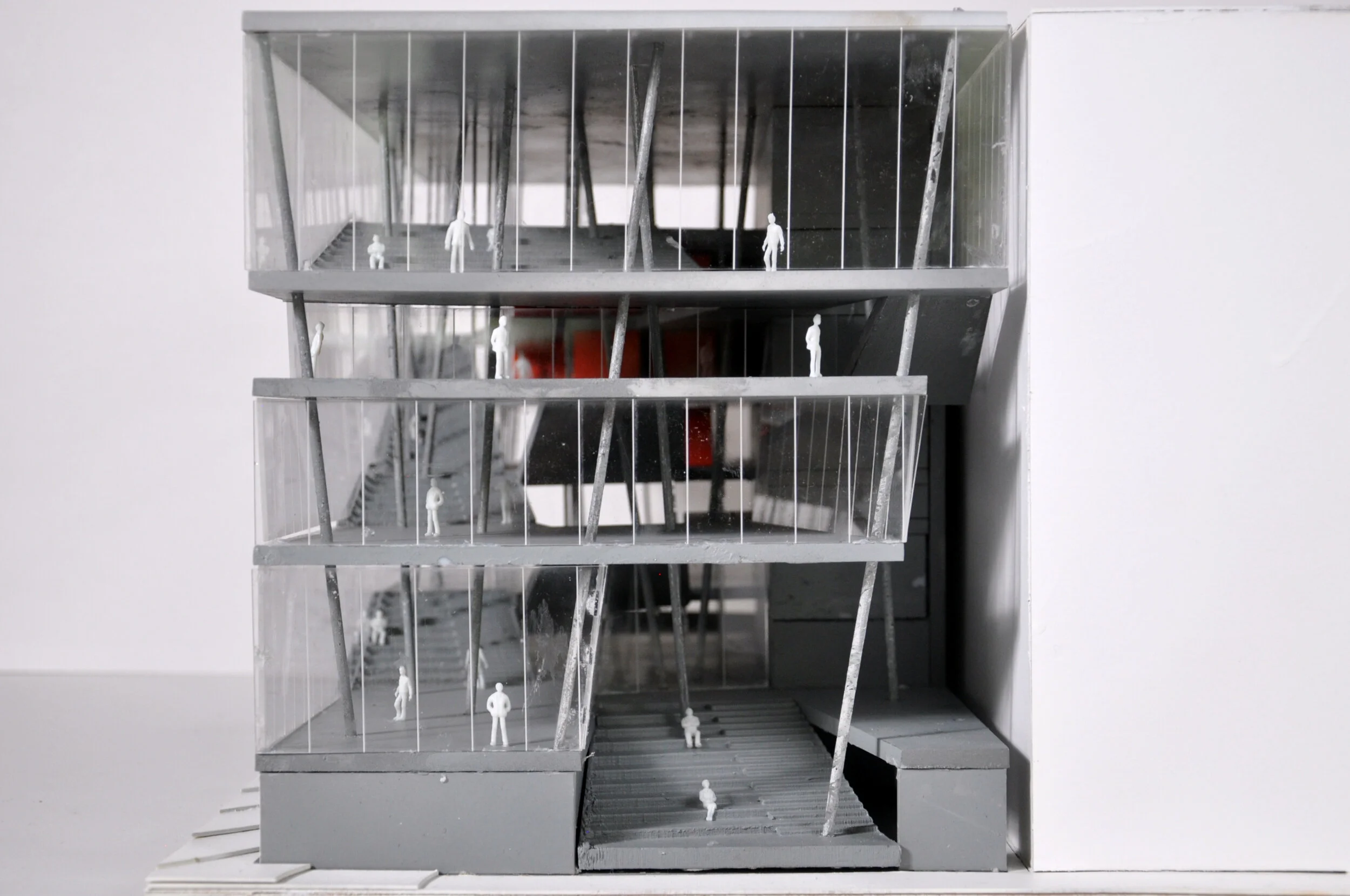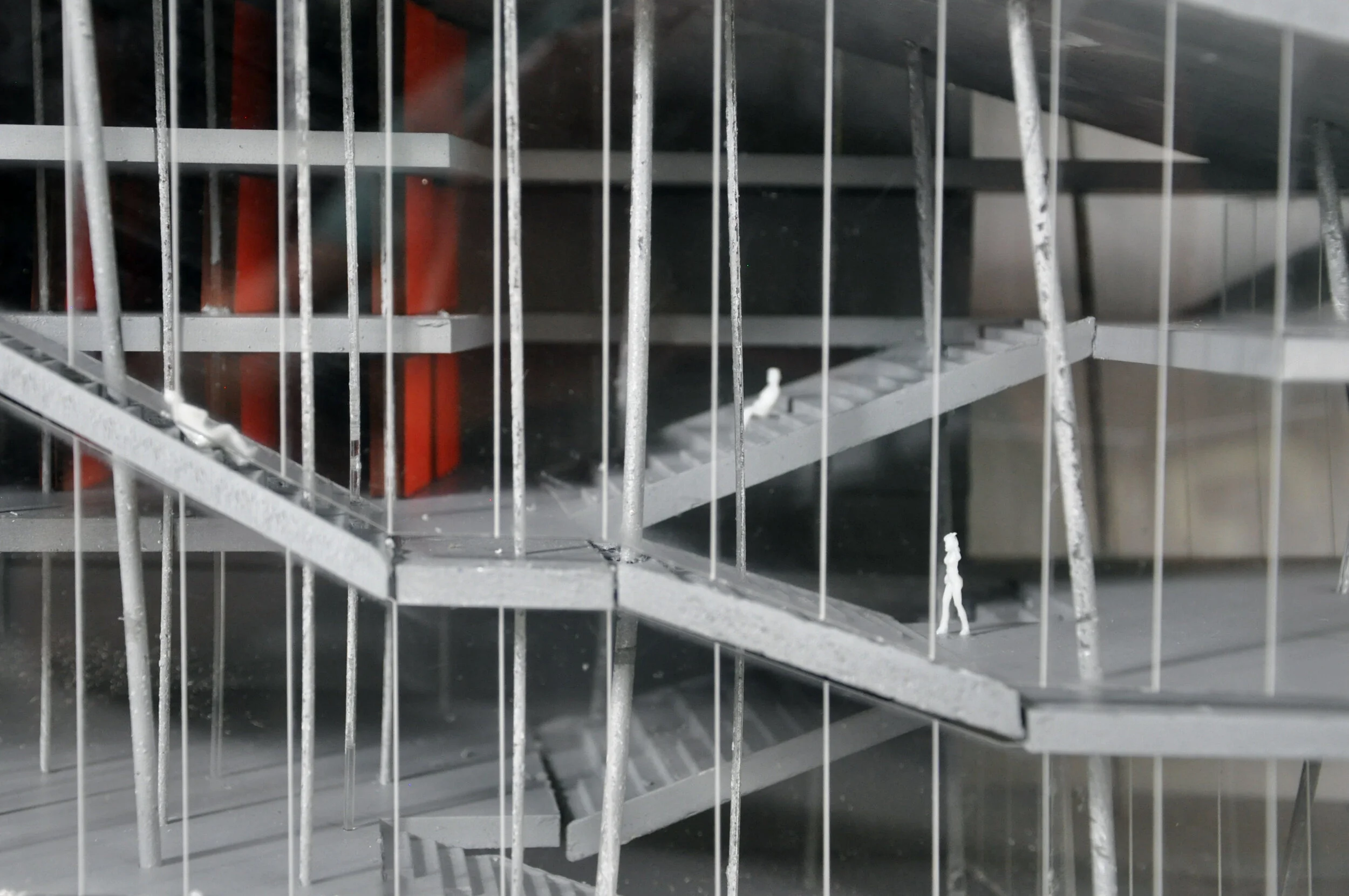 Multiple architectural systems are employed through the design of the library to create the aforementioned spectrum of programmatic spaces. Structure morphs from dense and ordered to open and loose. Intersecting the structure is a continuous floor plate that enables uninhibited movement between the multiple zones while simultaneously creating a third space of inhabitable circulation in the form of oversized stairs. Finally, a glass enclosure strategically pushes in to the building footprint creating exterior spaces responding to views and adjacencies of the site.