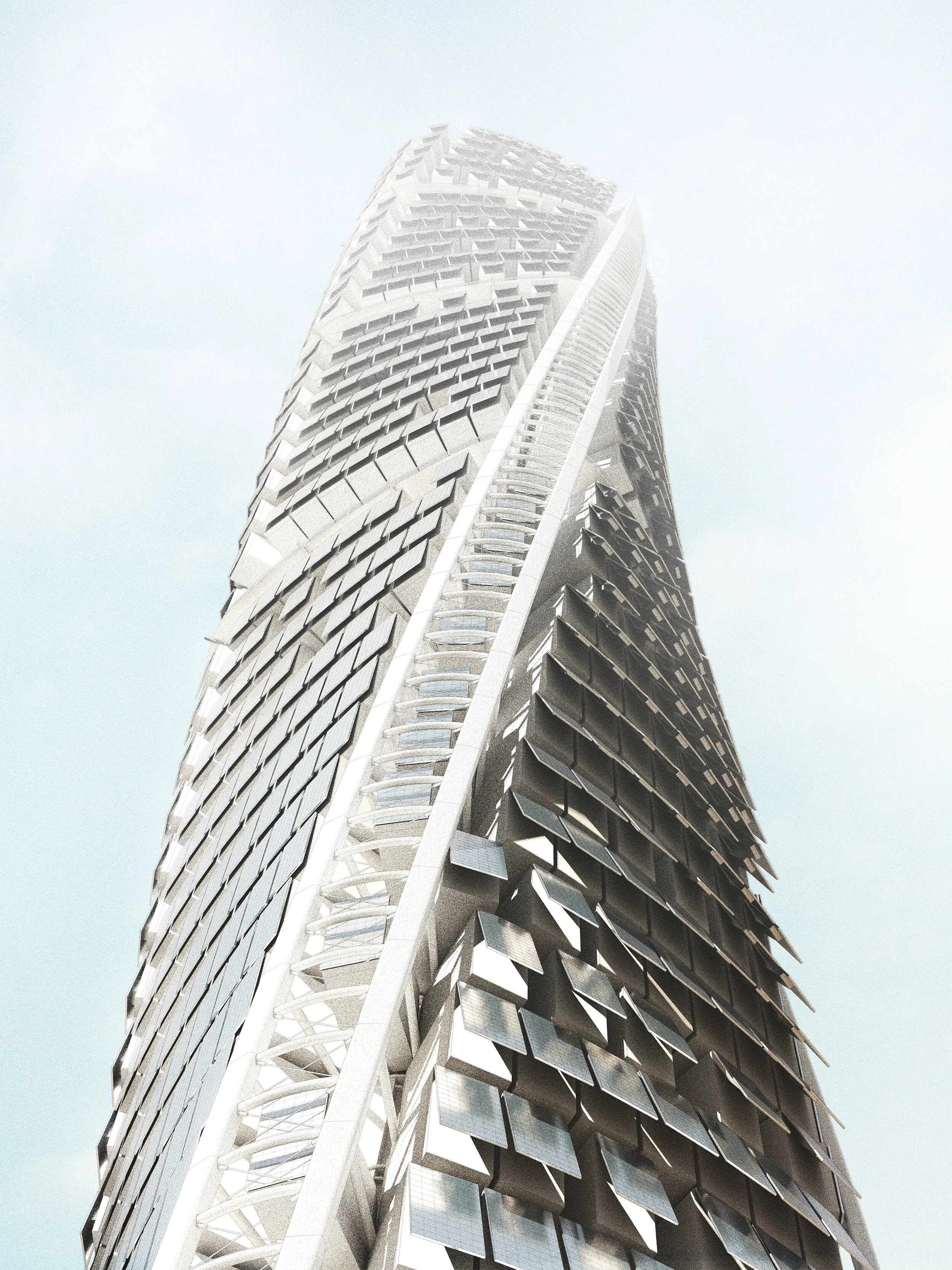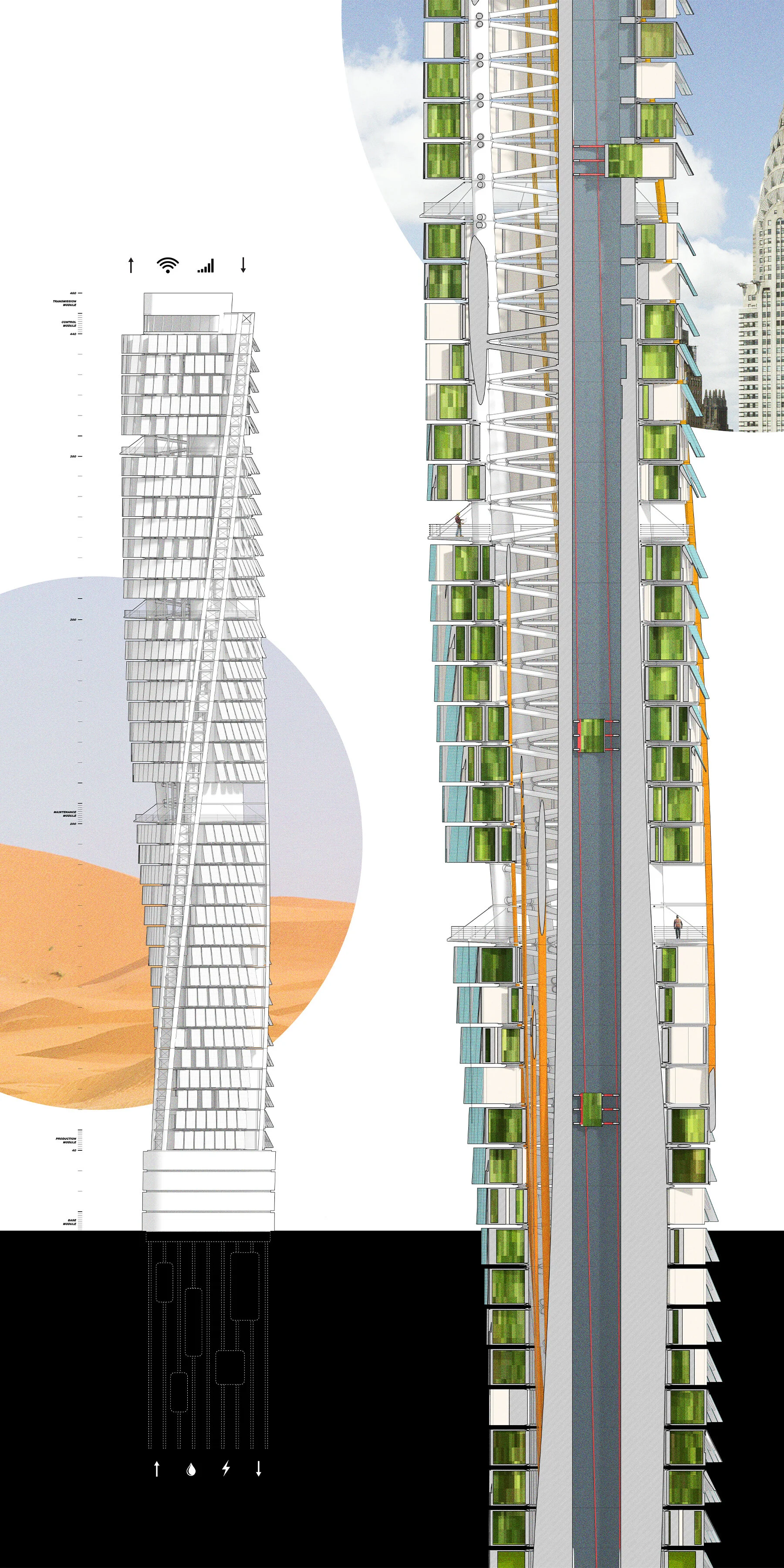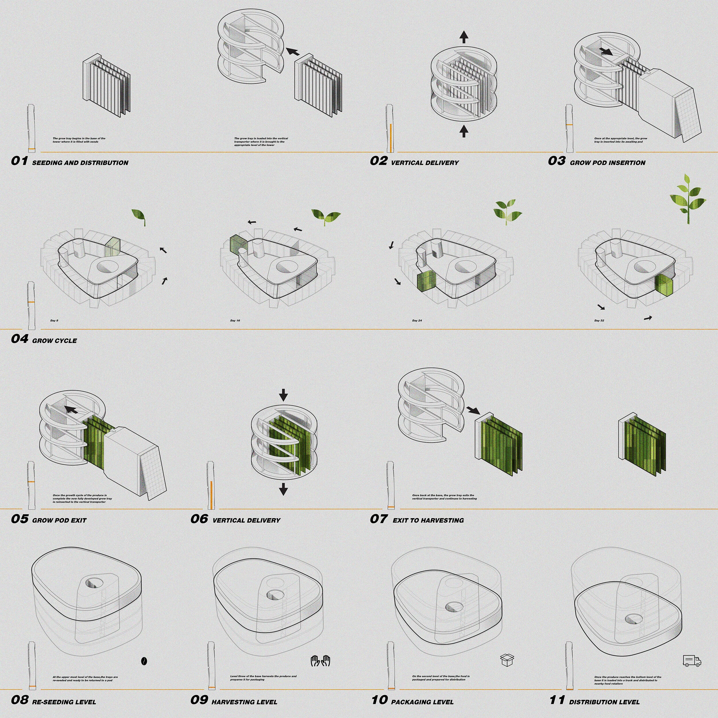 A series of modular plates house 30 self dependent grow pods which circulate the building in sync with the growth cycle of the produce within. Food is autonomously delivered to the base of the tower where it is harvested, pack-aged and distributed. Dynamic uv panels attached to each pod further track and optimize sun exposure throughout the day, transforming solar energy into the electricity which powers the pod’s specified internal grow light tubes, which in turn accelerate and enhance the plant growth cycles. The input of this information can be analyzed and utilized to ensure ultimate efficiency in production cycles in accordance with the demands of the consumer.